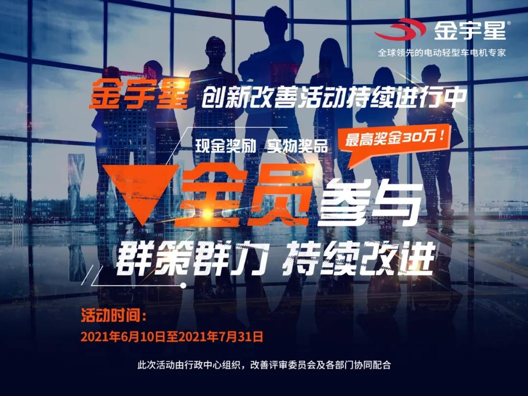 在接下來(lái)的6月、7月創(chuàng)新改善實(shí)施月,活動(dòng)將持續(xù)常態(tài)化開(kāi)展,公司各級(jí)主管需加大做好創(chuàng)新改善活動(dòng)方案宣導(dǎo),充分調(diào)動(dòng)員工的積極性,做到人人參與,通過(guò)每個(gè)員工的努力,主動(dòng)去發(fā)現(xiàn)問(wèn)題,主動(dòng)去解決問(wèn)題,把創(chuàng)新改善活動(dòng)做好做實(shí)。金宇星的家人們,在這炎炎夏日,讓我們一起來(lái)為公司獻(xiàn)策獻(xiàn)計(jì),掀起創(chuàng)新改善活動(dòng)的熱潮,為把金宇星打造成為電動(dòng)輕型車驅(qū)動(dòng)系統(tǒng)全球領(lǐng)導(dǎo)者而努力。